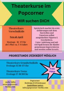 Popcorner kann stunden- oder tageweise für Kurse oder Workshops gebucht werden. Dabei sind wir an künstlerisch-kreativen Formaten interessiert.